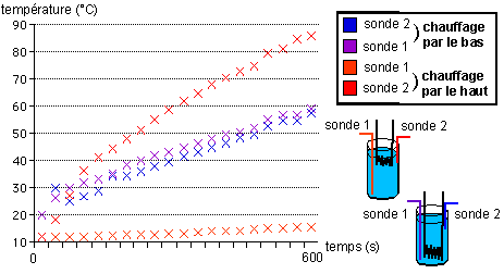 Schématisez les dispositifs expérimentaux de la p 137 (B4). Représentez graphiquement l'évolution en fonction du temps des températures de surface (sonde 1) et de fond (sonde 2) dans le cas d'un chauffage par le bas (en noir) et par le haut (en rouge). Analysez les courbes obtenues en les décrivant et en les interprétant.