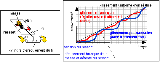 Le mouvement uniforme d'enroulement du fil symbolise le déplacement des plaques par entrâinement du manteau asthénosphèrique par exemple. La contrainte, accumulée dans la roche, est ici symbolisée par la tension du ressort. C'est donc le ressort qui accumule l'énergie cinétique et la restitue lors du mouvement brusque de la planchette surmontée de sa masse. |