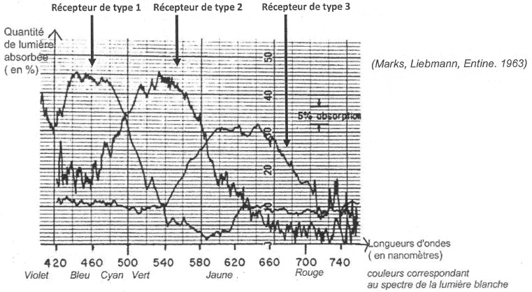En 1963, les travaux de Marks et d'autres équipes de physiologistes apportent un argument décisif en faveur de la théorie de Young, discutée depuis plus de 150 ans. A l'époque, l'expérimentation sur des cellules de rétine humaine, beaucoup plus petites que celles des poissons, présentait des difficultés techniques qui semblaient insurmontables. Ils mesurent donc la quantité de lumière absorbée par des cellules visuelles de poissons rouges. Les résultats obtenus sont regroupés dans le graphique ci-dessous.