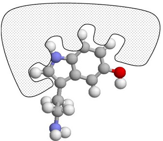 On a identifié le neurotransmetteur naturel impliqué dans la communication entre les neurones des voies visuelles. Il s'agit d'une molécule dont le nom est « sérotonine » et que l'on a représentée ci-dessous fixée à son récepteur neuronal.