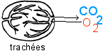 Les trachées des insectes sont des tubes extrêmement fins qui amènent directement les gaz aux cellules (ils sont d'ailleurs pleins d'eau à leur extrêmité, là où se font les échanges de gaz entre l'air et le milieu intérieur). L'appareil circulatoire a alors un rôle moindre dans le transport des gaz respiratoires. |