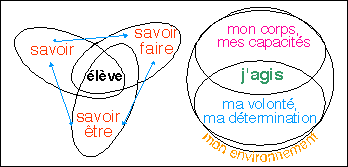 | objectif pluridisciplinaire | prise de conscience par l'enfant de ses capacités physiques et volontaires en face d'une activité physique à réaliser et à maîtriser.  Deux représentations de cette polyvalence: le savoir (sur le corps, sur la motricité;, sur le déplacement, l'équilibre.... avec une grande part disciplinaire aux SVT), le savoir faire (surtout EPS dans notre exemple, c'est l'agir physique qui est en cause) et le savoir-être (c'est la personne de l'enfant, son attitude, sa volonté, souvent qualifiée dans les objectifs disciplinaires de l'EPS). | |