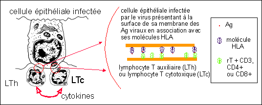 Réponse immunitaire T spécifique : les cellules infectées présentent des peptides viraux en association avec leurs molécules de classe I et II simultanément ce qui permet une co-activation des lymphocytes T auxiliaires et T cytotoxiques reconnaissant les peptides viraux en association avec l'une ou l'autre classe de molécules HLA. (Les T auxiliaires impliquées dans cette réponse anti-virale possèdent essentiellement le CD4+ et les T cytotoxiques le CD8+). Les T cytotoxiques (que l'on peut dans ce cas nommer LT8) sont activés SIMULTANEMENT par reconnaissance du peptide viral associé aux molécules HLA de la cellule infectée ET par des cytokines produites par les lymphocytes T auxiliaires effectuant le même type de double reconnaissance à partir des peptides viraux présentés en association avec les molécules HLA de la cellule infectée (que l'on peut nommer dans ce cas LT4). La cytokine principale mise en évidence dans cette activation est l'IL-2 (interleukine 2), produite par les LT activés. (On pense que, à la suite du contact CpAg-LT, le LT exprime les gènes de l'IL-2 , de certaines moléculaires membranaires dont les récepteurs à l'IL-2. La fixation de l'IL-2 aux récepteurs de la cellule qui la produite l'autostimule et déclenche notamment la division cellulaire...L'IL-2 est considérée comme une hormone car elle est transportée par la circulation sanguine et active les cellules NK, les lymphocytes B ; à forte dose est déclenche dune fièvre, une hypotension, et de graves modifications physiologiques....).