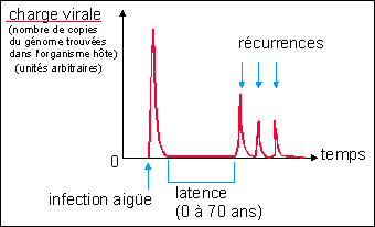 Remarque : la plupart des infections virales ne provoquent aucun signe visible ou correspondent à des maladies bénignes (légère fièvre par exemple). L'issue d'une maladie virale dépend de facteurs liés au virus (cytopathogénie, moyens de contourner le système immunitaire...) mais surtout de l'état du système immunitaire de l'hôte. Dans le cas d'un virus herpès la première infection est souvent inapparente (aucun signe clinique visible), puis le virus se localise dans les neurones sensitifs. Une réactivation peut avoir lieu très longtemps après à l'occasion d'un stress, d'une irradiation u.v. ou d'un déficit immunitaire (SIDA par exemple).
